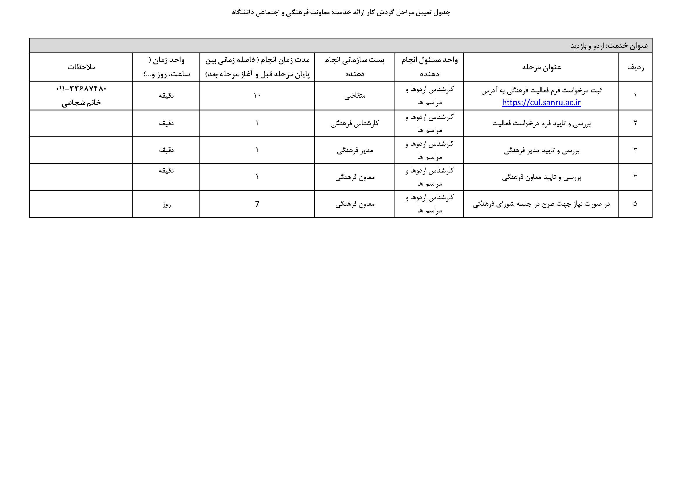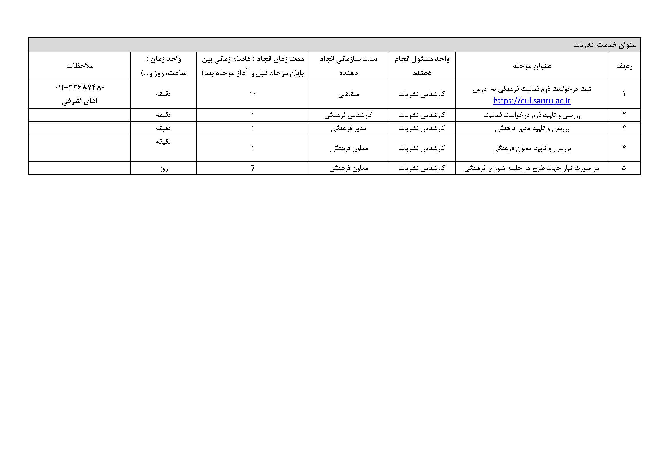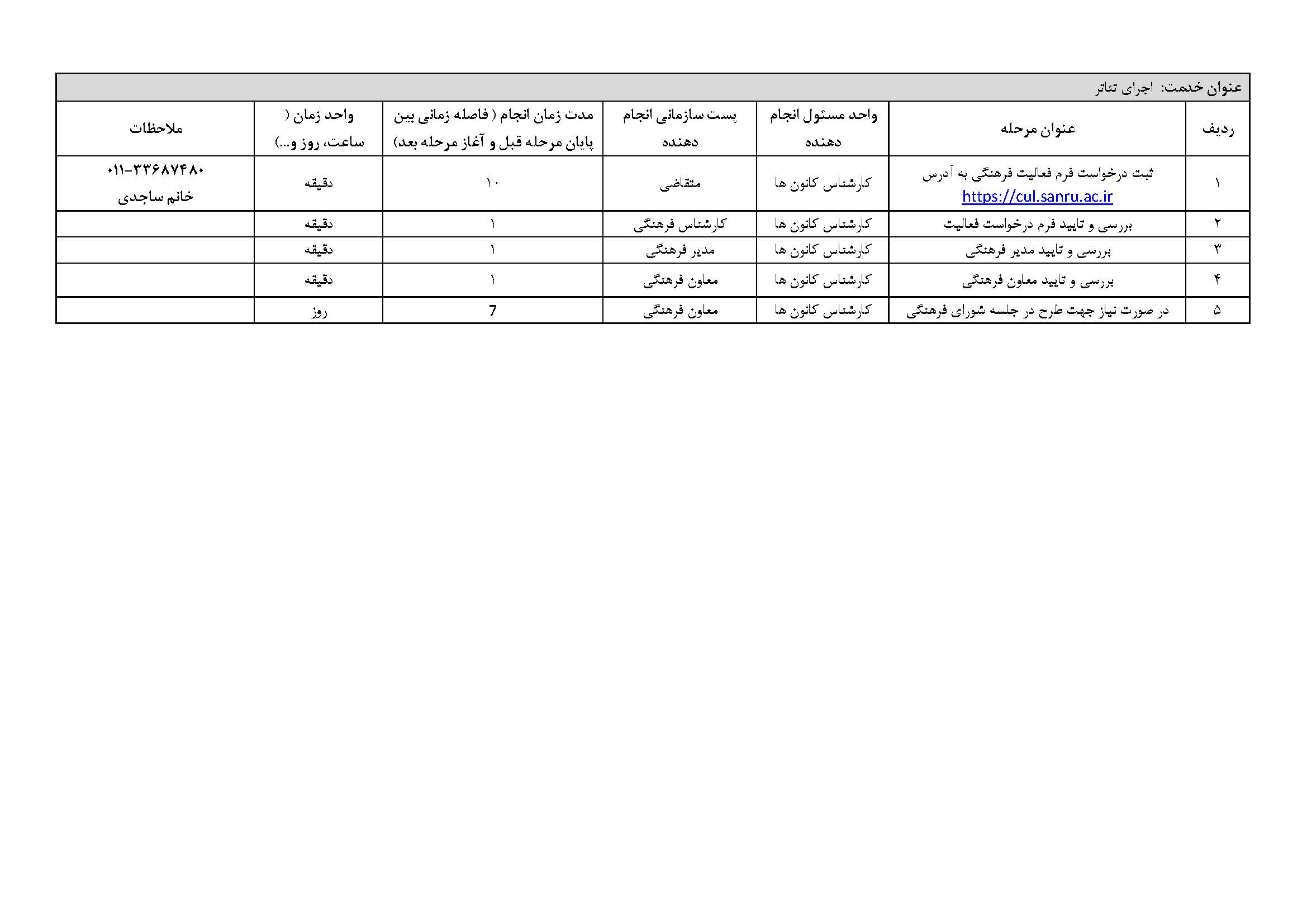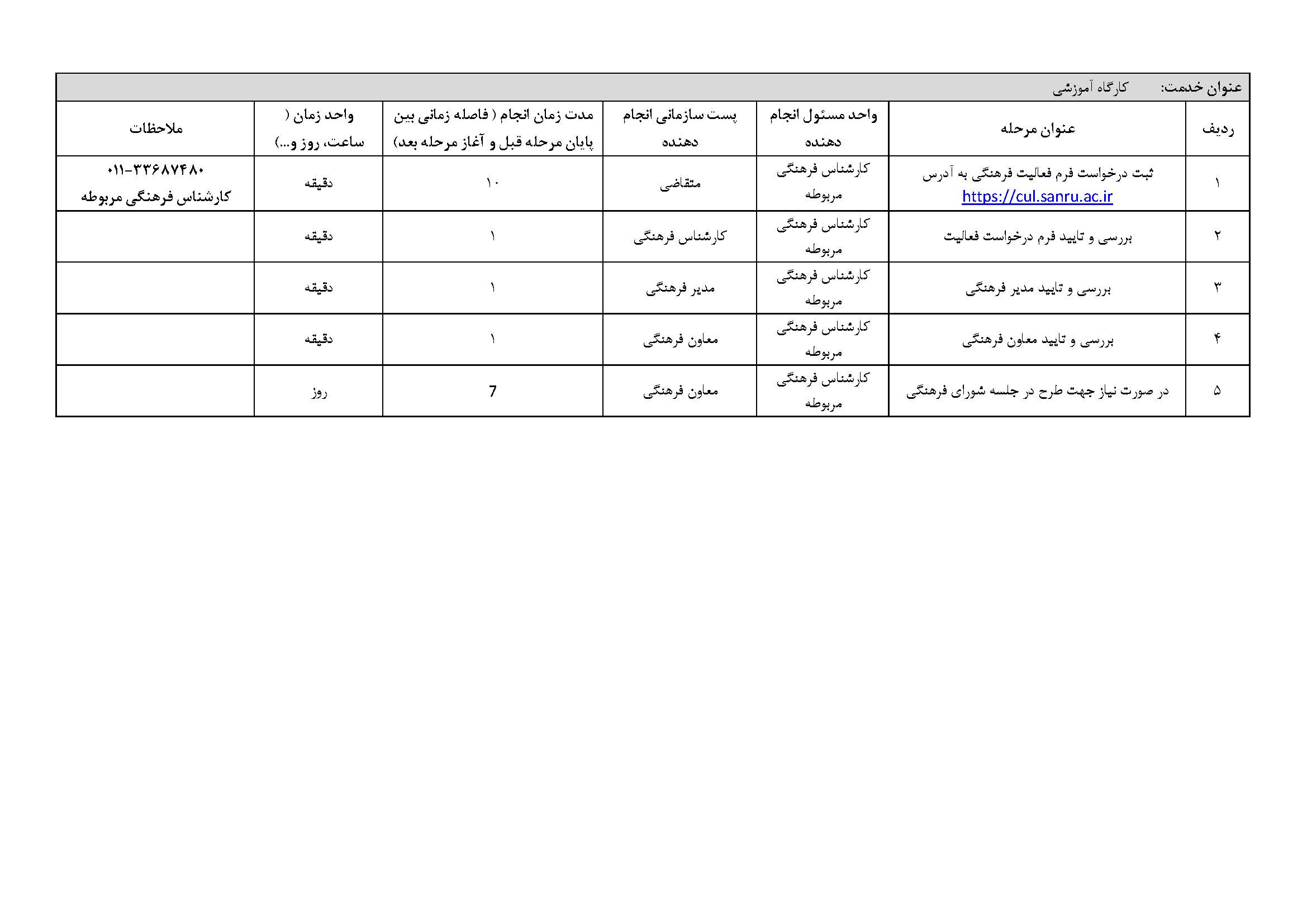 ردیف عنوان خدمت راهنما ویدئو راهنما گردش کار لینک خدمت دستورالعمل و آئیننامه سوالات متداول مرتبط با خدمت 1 اردو و بازدید 2 اجرای تئاتر 3 جشنواره 4 سمینار 5 سخنرانی 6 کرسی آزاداندیشی 7 همایش 8 پخش فیلم 9 کارگاه آموزشی 10 نمایشگاه 11 نشریات 12 سایر فعالیت ها